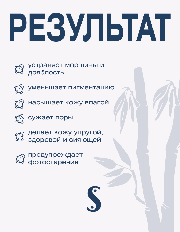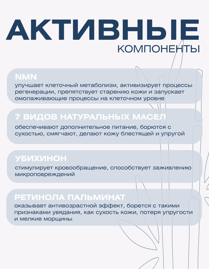 В состав средства входят высокоочищенные частицы NMN - популярного косметического ингредиента - никотинамидмононуклеотид (NMN), который улучшает клеточный метаболизм, активизирует процессы регенерации и препятствует старению кожи.
