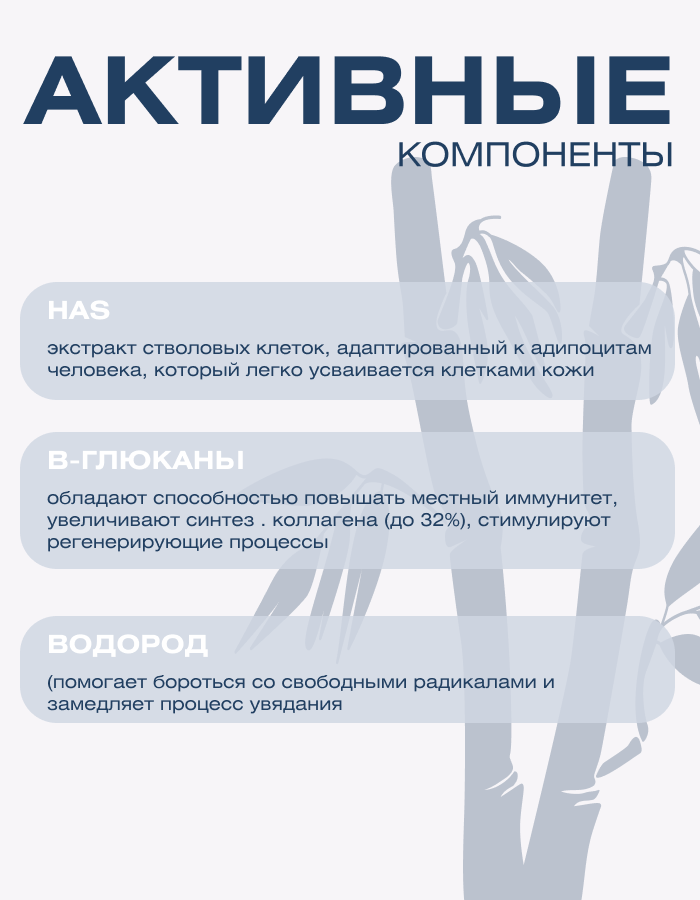 - HAS - экстракт стволовых клеток, адаптированный к адипоцитам человека, который легко усваивается клетками кожи, встраивается в эпидермис и восстанавливает поврежденные участки, борется с сухостью, дряблостью и возрастной пигментацией.