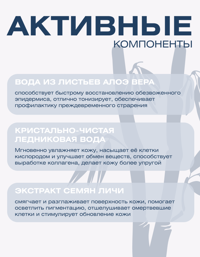 После нанесения лосьона ингредиенты проникают во все слои дермы, увлажняют и оздоравливают ее, сохраняя эффект до 12 часов.