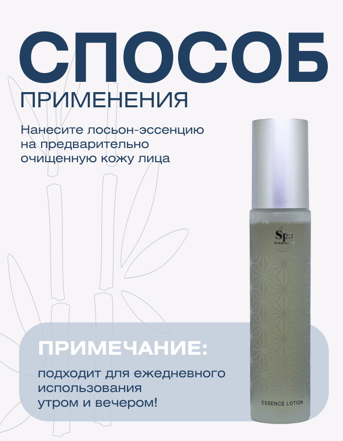 Концентрированный лосьон Spa Treatment Essence Lotion восстанавливает структуру герминативной ткани. Благодаря этому клетки получают интенсивное питание, восстанавливается гидробаланс, кожа становится эластичной и упругой, приобретает здоровый сияющий вид.