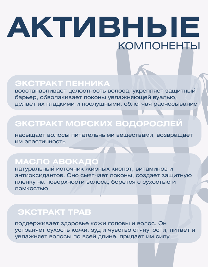 • Экстракт морских водорослей насыщает волосы питательными веществами, возвращает им эластичность.