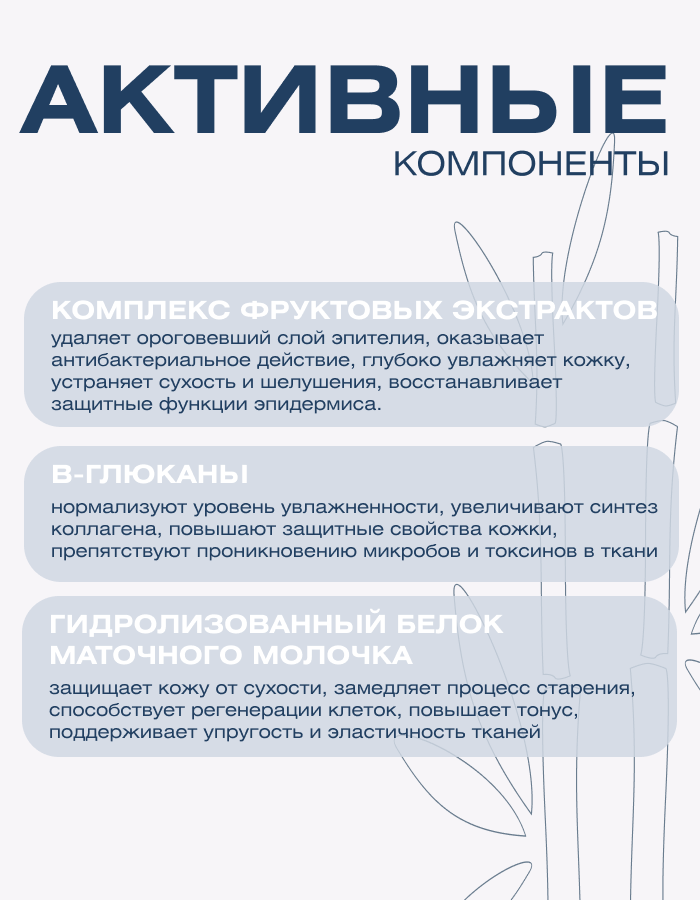 - Комплекс фруктовых экстрактов удаляет ороговевший слой эпителия, оказывает антибактериальное действие, глубоко увлажняет кожу, устраняет сухость и шелушения, восстанавливает защитные функции эпидермиса.