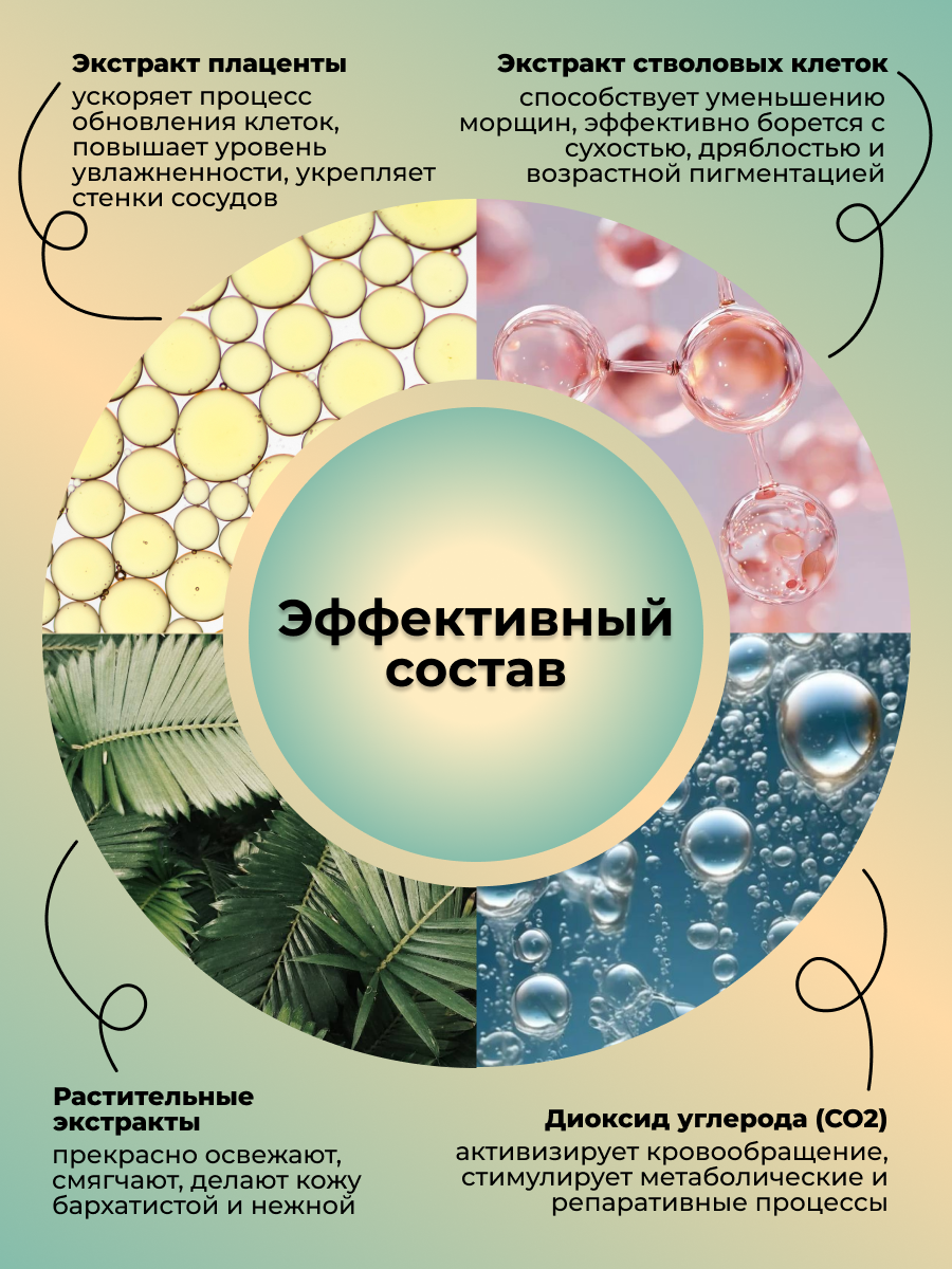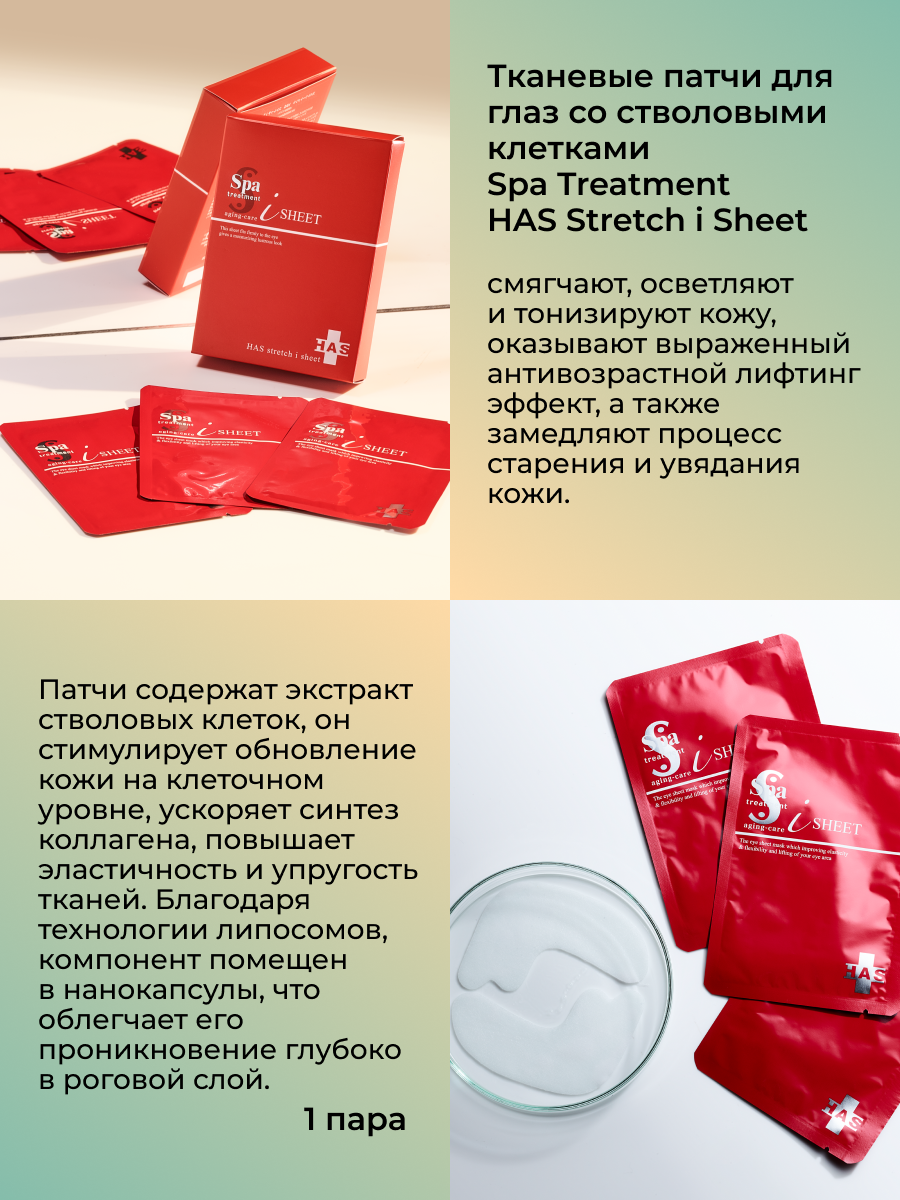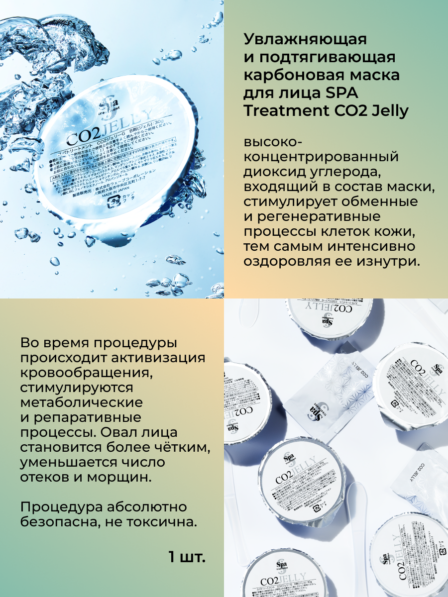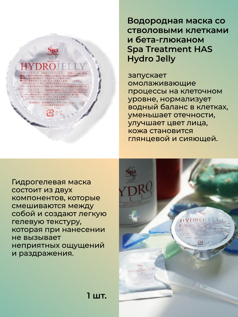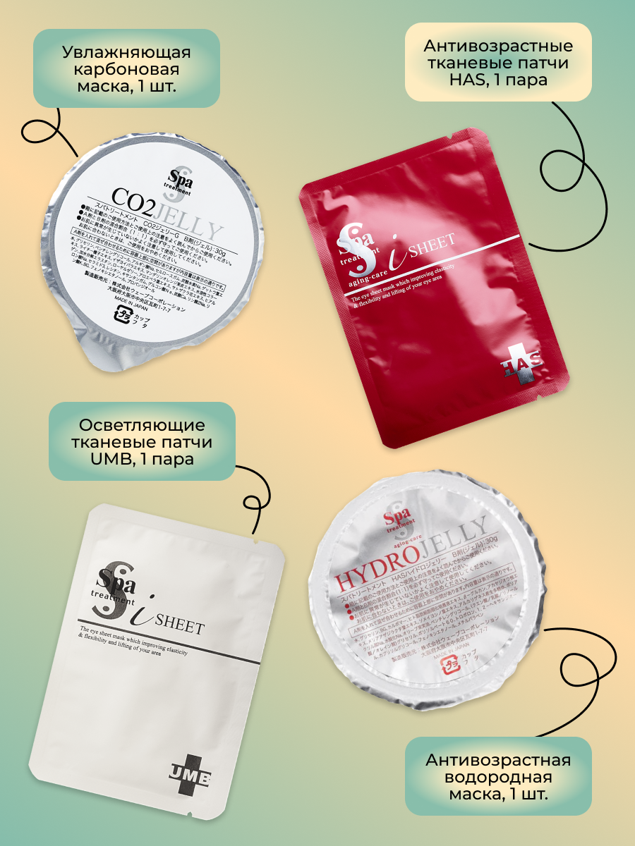 1. Двухкомпонентная водородная маска с экстрактом стволовых клеток Spa Treatment Hydro Jelly: 1 шт.; 2. Двухкомпонентная маска Карбокситерапия для интенсивного омоложения кожи SPA Treatment CO2 Jelly: 1 шт.; 3. Spa Treatment UMB Stretch i Sheet - антивозрастные патчи: 1 пара; 4. Патчи для глаз со стволовыми клетками Spa Treatment HAS Stretch i Sheet 1 пара.