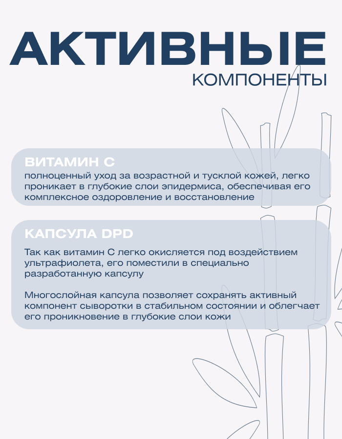 Многослойная капсула позволяет сохранять активный компонент сыворотки в стабильном состоянии и облегчает его проникновение в глубокие слои кожи.