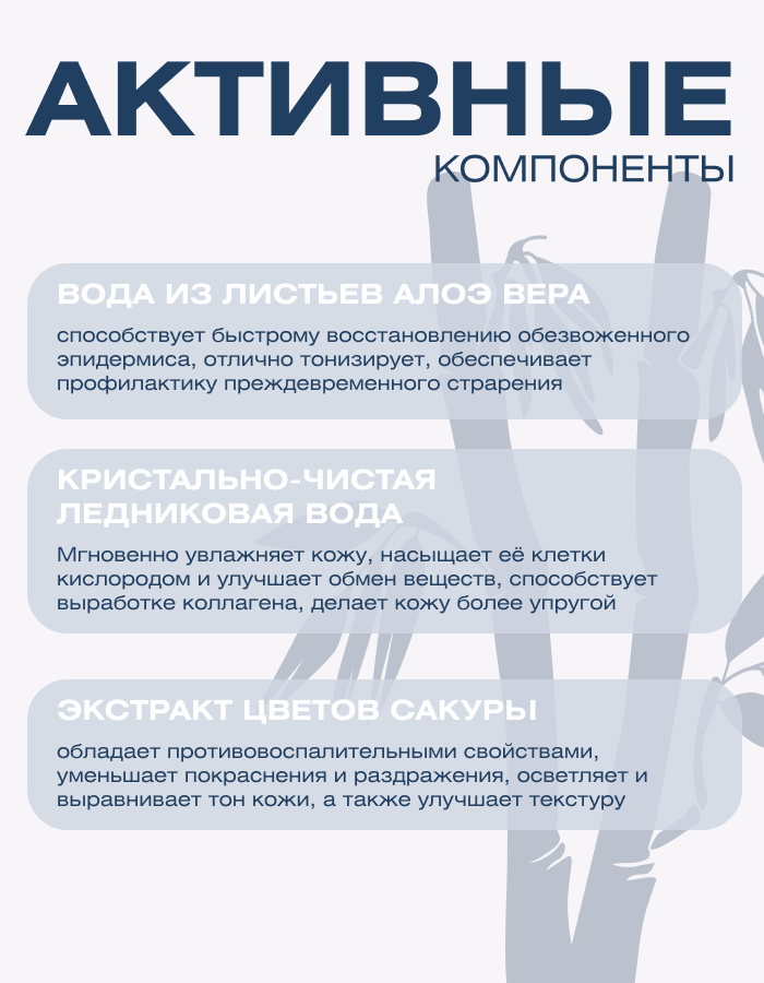 Ледниковая вода насыщает кожу минералами, блокирует действие свободных радикалов, обладает мощными влагоудерживающий свойствами, оказывает антисептический и бактерицидный эффекты, способствуют регенерации тканей.