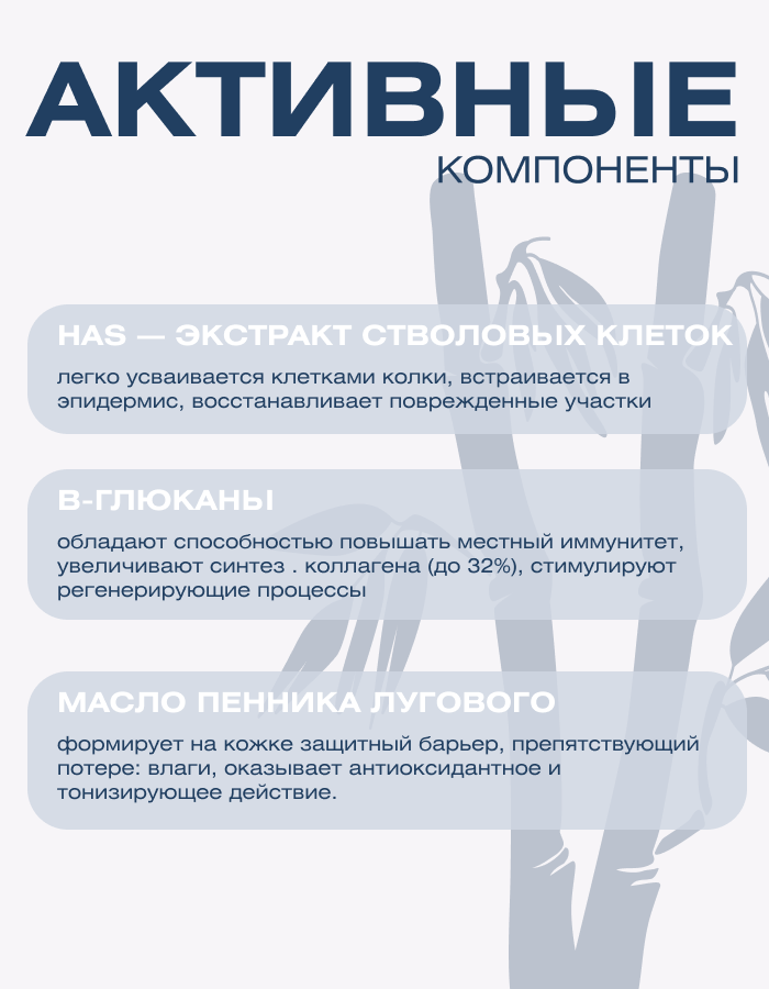 - HAS - экстракт стволовых клеток -легко усваивается клетками кожи и встраивается в эпидермис, восстанавливает поврежденные участки, уменьшает морщины, борется с сухостью, дряблостью и возрастной пигментацией, препятствует потере влаги.